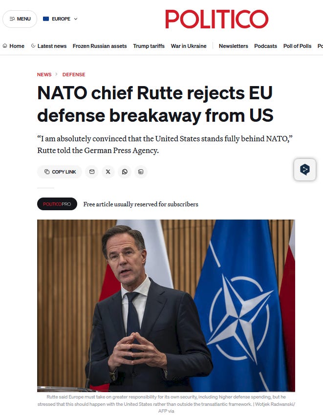 Intre timp, Rutte insista sa creada ca mariajul SUA-NATO este inca functional desi exista toate semnalele ca Washingtonul nu se va implica intr-un conflict cu Rusia ba as spune ca, dimpotriva, face tot posibilul sa saboteze intentiile razboinice ale europenilor si o face atat de bine ca pana si Boris Pristorius iese si declara ca “nu crede in scenariul unei confruntari directe intre Rusia si NATO”.