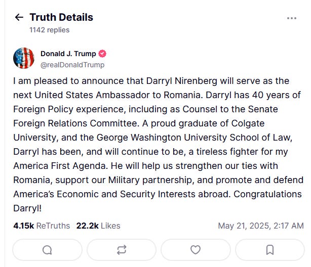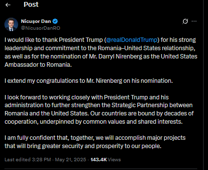 Pe 21 mai 2025, Trumpil felicita pe ambasadorul SUA si anunta speranta ca acesta va sintari “parteneriatul militar cu Romania” si va “promova si apara interesele economice si militare dincolo de granitele Americii”.