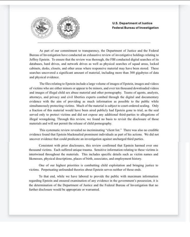 „Această analiză sistematică nu a dezvăluit nicio «listă de clienți» incriminatoare. De asemenea, nu a existat nicio dovadă credibilă că Epstein ar fi șantajat persoane proeminente ca parte a acțiunilor sale. Nu am descoperit dovezi care să justifice deschiderea unei investigații împotriva unor terțe părți neacuzate.”