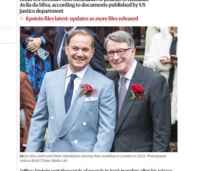 Bunaoara, Lordul Peter Mandelson, apare in chilotei alaturi de o tanara speranta a Insulei lui Epstein. Politician britanic bine infipt in Partidul Laburist, in perioada cand frecventa budoarul cu prospaturi era o prezenta nelipsita la sedintele Grupului Bilderberg dar nu asta e esential aici ci faptul ca individul, cum sa zic… Ah, da, a jucat la nunta cearseaful pe maro, semn ca e posibil sa fie un heterosexul sub acoperire caci in poza clar e o duduie. Sau cine stie, ca are halatul incheiat!
