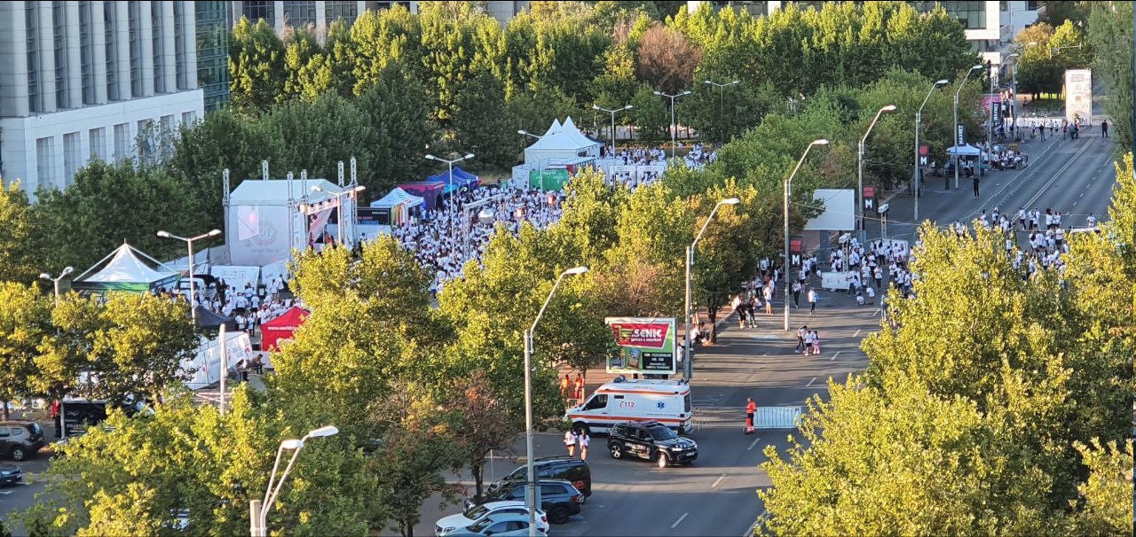 Cinci sute de netoti, imbracati in tricouri albe, de la Kaufland, pusi sa sara in sus pe pompe de 1 KW si urlete onomatopeice ce mimeaza entuziasmul din lumea “animatorilor”.